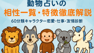 占いコラム 動物占いの相性一覧表で特徴や性格を徹底解説!全60分類キャラクターの恋愛・仕事・友情無料診断付き 「動物占いで自分や相手の性格・相性が気になる」「たくさんの動物タイプがあってよく分からない」と悩んでいませんか?実は、動物占いは【12種類】の動物キャラクターと、さらに色や生年月日による【60分類】に細分化されており、各動物タイプごとに”恋... 2025.07.30 占いコラム